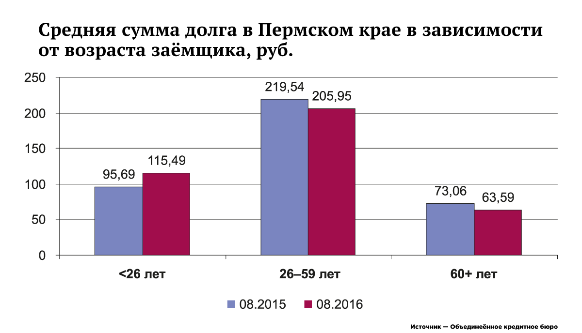 В 2016 году наблюдается тенденция «старения» банковских заёмщиков. Например, по данным Национального бюро кредитных историй, банки увеличивают долю заёмщиков в возрасте старше 50 лет. В Пермском крае только за первые семь месяцев этого года она возросла с 23 до 23,7%. Объединённое кредитное бюро (ОКБ) приводит схожие данные о доле заёмщиков пенсионного возраста. При этом в исследовании, проведённом ОКБ, отмечается, что если в 2014 году доля этой возрастной группы была примерно равна доле заёмщиков в возрасте 30—40 лет, то теперь сегмент 50+ является наиболее весомым в структуре банковских заёмщиков.