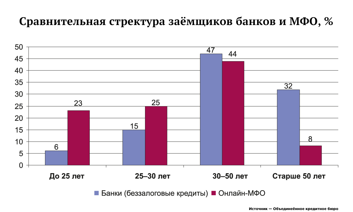 Иначе обстоит дело в микрофинансовых организациях. По словам Бориса Батина, генерального директора сервиса онлайн-кредитования MoneyMan, средний возраст клиентов этой МФО составляет всего 29 лет. При этом на группу клиентов в возрасте от 25 до 30 лет приходится 38% всех пользователей. Эксперт отмечает, что клиенты онлайн-компаний значительно моложе пользователей традиционных МФО, поскольку использование разнообразных онлайн-сервисов является для них привычным. Кроме того, они нередко испытывают дефицит времени, поэтому предпочитают онлайн-займы посещению стационарных офисов.