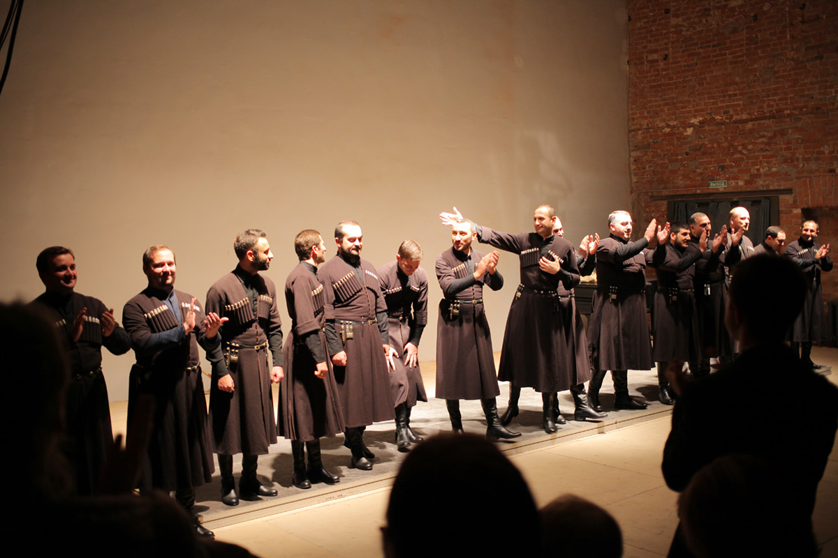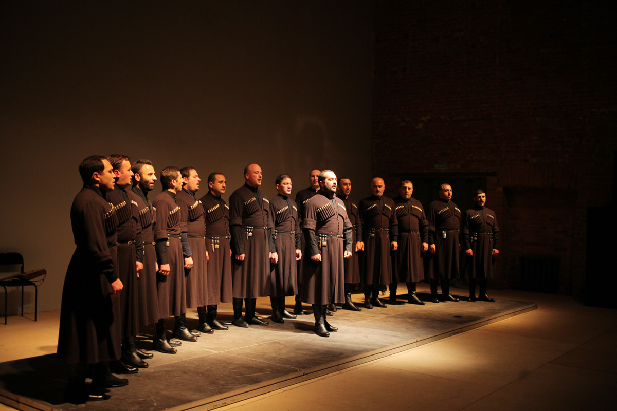 Начало концерта взорвала кахетинская застольная песня «Мравалжамиер» («Многолетие»). Пятнадцать мужских голосов торжественно и громогласно удерживали одну ноту, с первых мгновений захватив пространство зала и заставив его резонировать. Впрочем, типичное представление о грузинском хоре быстро раскрылось множеством удивительных частностей. Внешняя статичность происходящего — певцы в тёмных чохах неподвижно стоят в линию — служила рамкой для обзора певческого калейдоскопа территориально небольшой, но музыкально необозримой земли. Имеретинская дорожная песня, любовная, гурийская свадебная песня, тропарь Святого Георгия… Список композиций больше напоминал статьи этнографической энциклопедии.