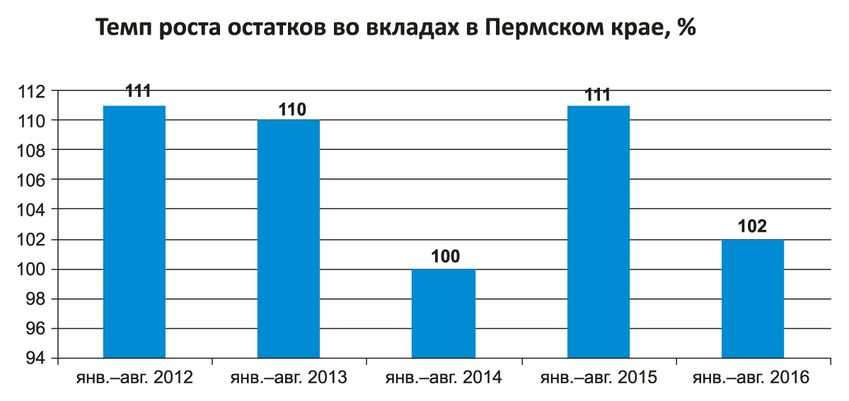 Несмотря на кризис, вклады в Пермском крае сохраняют положительную динамику, однако темп этого роста в текущем году существенно замедлился. По данным Банка России, накопленный объём розничных депозитов к 1 сентября 2016 года составил 296 млрд руб., это лишь на 2% больше, чем на начало года. Годом ранее за этот же период вклады приросли на 11%.