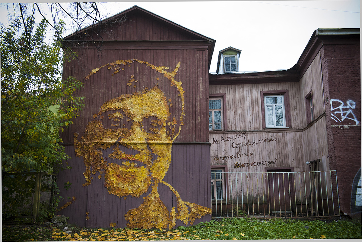 Александр Жунёв продолжает «населять» улицы Перми поэтами. Вот уже семь лет с недостроя на Луначарского смотрит на нас нарисованный им Сергей Есенин. В прошлом году фасад многоэтажки на Парковом украсил Василий Каменский. Нынче 3 октября на стене деревянного дома в сквере Пушкина Жунёв выложил из палой листвы портрет Юрия Шевчука. О том, какое напластование смыслов вскрывается за каждой его работой и чего он хочет добиться, занимаясь стрит-артом, художник рассказал Ольге Дерягиной.