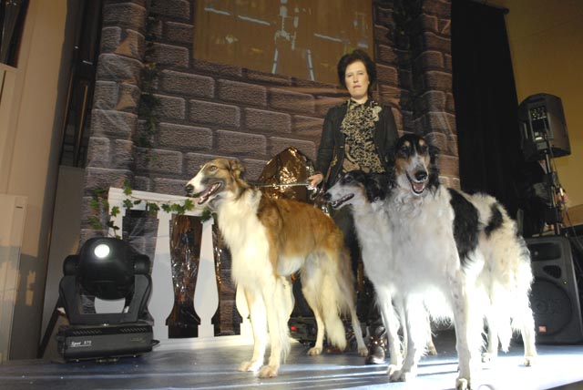 Для создания охотничьего антуража на сцену, «загримированную» под балкон старинного замка, вышли несколько специально приглашенных «моделей» — роскошные охотничьи борзые. Породистые собаки отменно гармонировали с «охотничьей» коллекцией из брюк-галифе и бриджей, трикотажных жакетов с мехом, дубленок, вязаных шапочек и кепи.