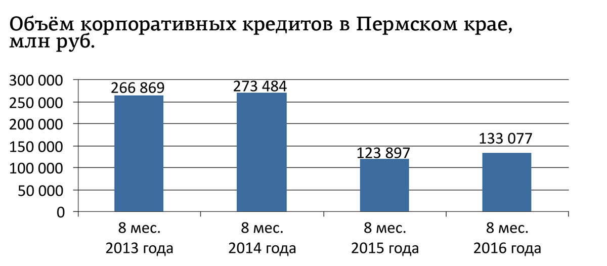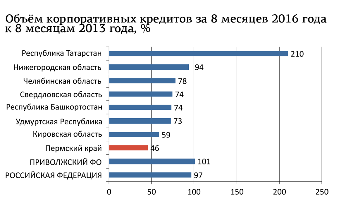 Случай Пермского края — в числе наиболее тяжёлых: в январе-августе 2016 года объём корпоративного кредитования был в 2,2 раза ниже, чем в том же периоде 2013 года. Это выделяет Прикамье из ряда соседних регионов: в большинстве из них объёмы кредитования снизились лишь на четверть. В то же время по абсолютному объёму выдач мы входим в топ-20 регионов России.