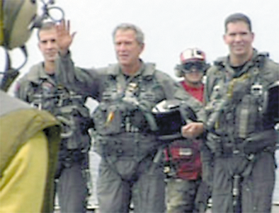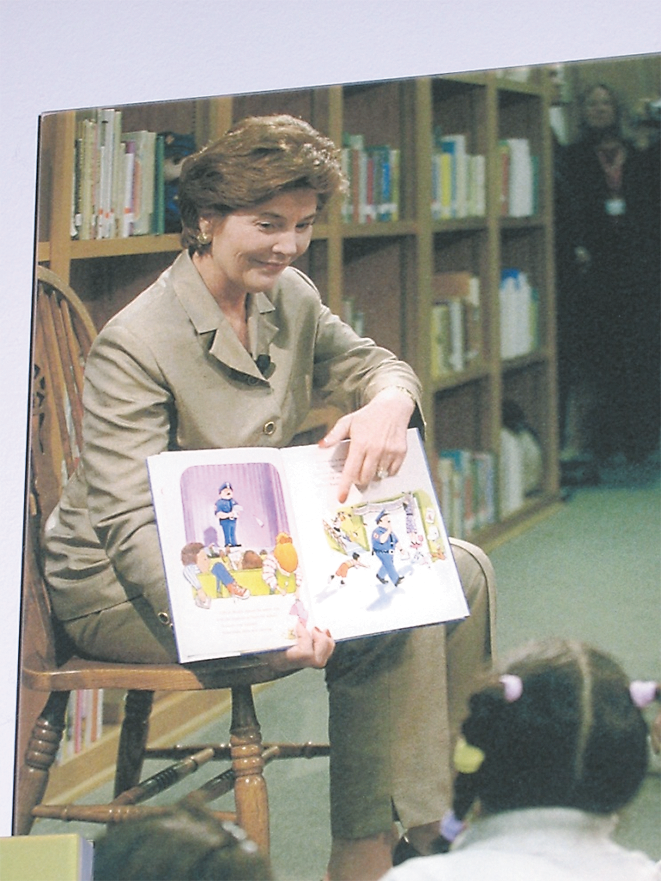Посмотрите, как изображены Джордж Буш-младший и его жена Лора. Его президентство, как вы помните, было полным фиаско: он устроил войну в Ираке, не справился с последствиями урагана Катрина, при нём начался затяжной экономический кризис. Но как он показан? На аэродроме в военной форме. А вот его жена — она пропагандирует детское чтение. Традиционное занятие первой леди, принципиально неполитическое: кто же будет против детского чтения?