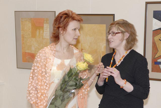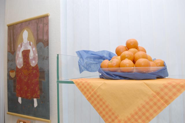 Начавшийся после вернисажа фуршет доказал, что оранжевый цвет может украсить не только стены и одежду, но и стол: в меню «солировали» мандарины, красная икра и красная рыба в пирожках, испеченных монахинями дружественного монастыря. А именинный торт был сделан в форме заманчивой морковки.