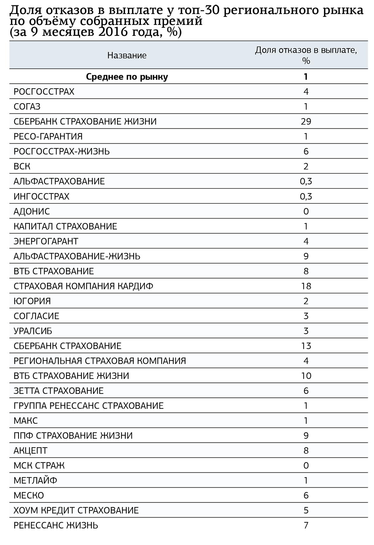 При средней по рынку доле отказов в выплате в 1% у некоторых страховщиков она составляет десятки процентов. Прямая связь между масштабом страхового бизнеса и готовностью компании выплачивать ущерб отсутствует. Среди страховщиков с минимальной и максимальной долей отказов встречаются как крупные, так и мелкие компании. Например, среди топ-30 регионального рынка по объёму собранных премий доля отказов колеблется от 0 до 29%. Впрочем, отчасти эта цифра зависит от специализации страховой компании на тех или иных видах страхования.
