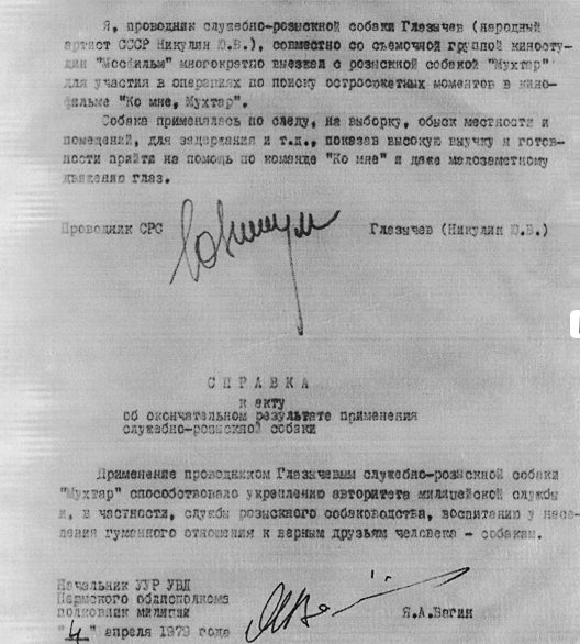 После выхода на экраны фильма «Ко мне, Мухтар!» в 1964 году служебное собаководство в стране получило дополнительный импульс. Кстати, Юрий Никулин, который сыграл в фильме главного героя, приезжал в пермский питомник служебного собаководства при УВД Пермской области и перед съёмками и позднее, когда фильм уже стал культовым. В музее пермского УВД сохранился удивительный документ, в котором Юрий Никулин от лица своего героя как бы рапортует о работе, проведённой с собакой по кличке Мухтар, а легендарный начальник уголовного розыска Пермской области Яков Вагин отвечает ему актом, в котором пишет, что всё это укрепило «авторитет милицейской службы» и, в частности, «разыскного собаководства». Шутки шутками, но на тот момент пермское служебное собаководство уже было одним из лучших в стране.