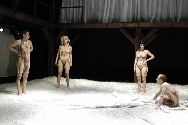 Если сказано, что герои должны предстать в наготе, как Адам и Ева, то, значит, так они и предстанут. Разумеется, нагота здесь условная, но очень наглядная: на артистах — трико телесного цвета, на которых с возрожденческой щедростью и откровенностью прорисована вся анатомия.