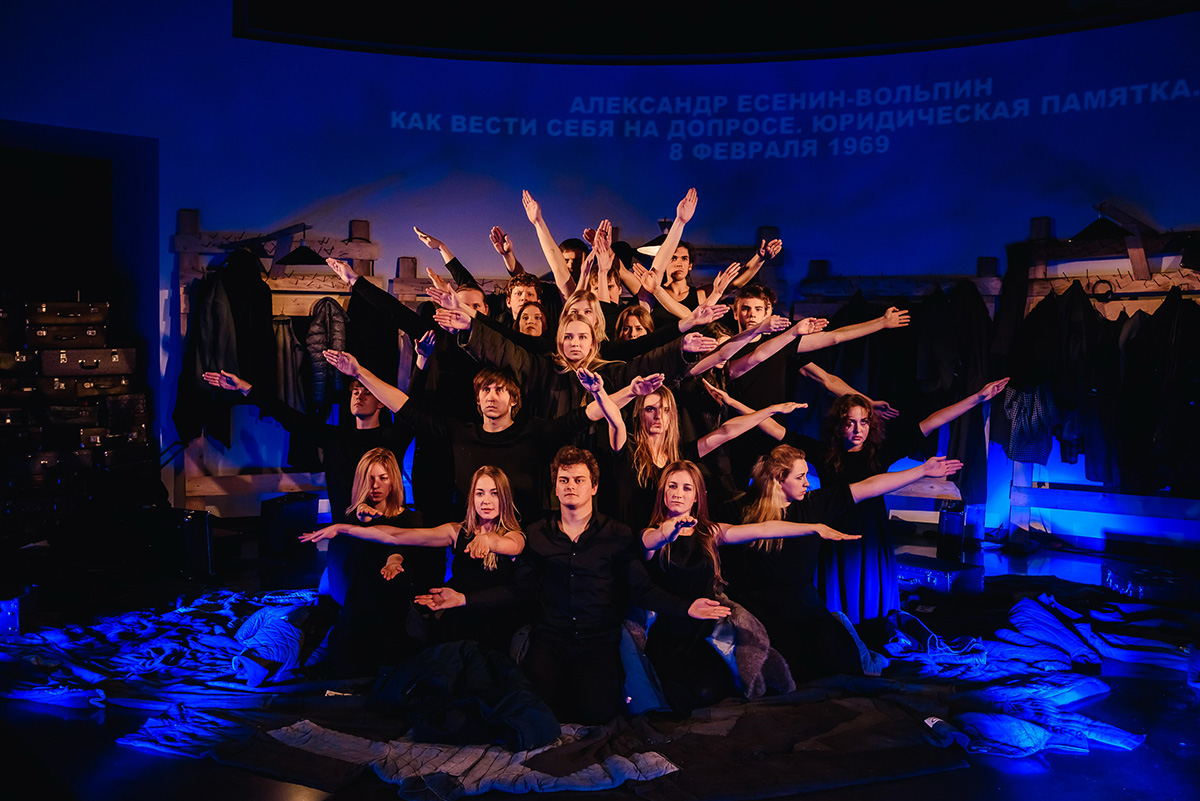 Играют #конституциярф начинающие актёры — студенты Института культуры и стажёры театра. Для них эта работа стала мощным профессиональным тренингом: нечеловеческие объёмы текста, выученного наизусть, бесконечные пластические этюды. В результате — редко когда приходится видеть настолько идеально отрепетированный спектакль. Здесь, как в балете, каждое движение продумано и встроено в ткань сценического действия. Актёрский коллектив действует как большой многорукий и многоголовый организм — и в один прекрасный момент действительно в него превращается: на сцене многоглазое и многорукое нечто, движущееся так единообразно и так продуманно, что нет сомнений: это не группа людей, а один гиперчеловек.
