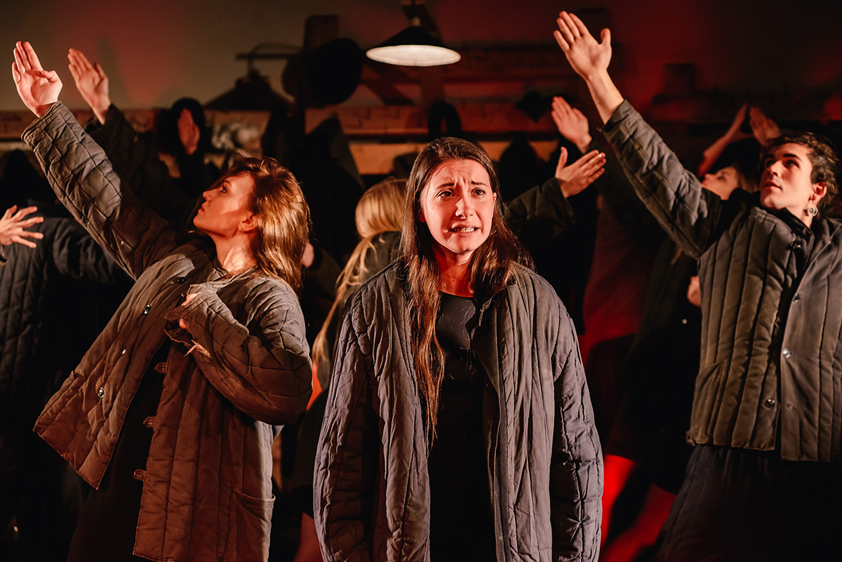 Владимир Гурфинкель говорит, что в этом-то и есть сюжет спектакля: на протяжении всего действия каждый из актёров говорит «я», а в финале все «я» собираются в «мы» и хором произносят преамбулу Конституции: «Мы, народ Российской Федерации…» Играет молодёжь так ровно, что невозможно выделить кого-то из общей массы. Все — на уровне, все молодцы. Об отдельных актёрских работах говорить не приходится: они как бы есть, но в то же время их как бы и нет.