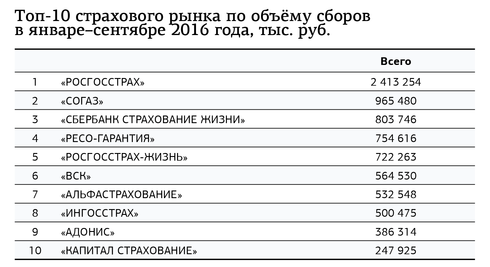 Концентрация рынка остаётся достаточно высокой: половину рынка «держит» первая четвёрка, а десятка лидеров обеспечивает уже 80% всех страховых сборов.