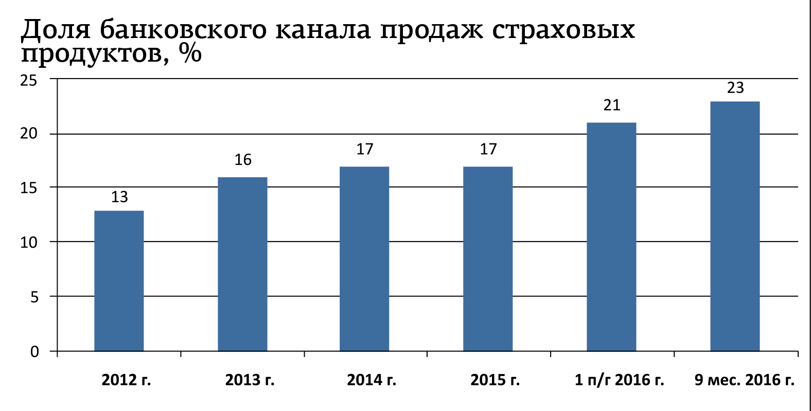 Зато позиции банков как агентов страховщиков становятся всё более прочными. Если год назад доля этого канала продаж страховок составляла 17%, то по итогам девяти месяцев 2016 года — уже 23%.