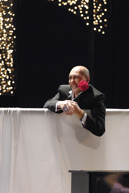 Кстати, об официантах. Трое проворных «прислужников» с безупречной выправкой (Дмитрий Васев, Алексей Шумков, Артем Орлов) плюс содержатель кофейни (Олег Выходов) постоянно присутствуют на сцене под тем или иным сюжетным предлогом — то накрывая стол для Паратова, то организуя обед дома у Карандышева, то угощая всю честную компанию прожигателей жизни завтраком на «Ласточке»… Эти официанты — полуактеры-полузрители, безмолвные свидетели личной драмы Ларисы Огудаловой. В начале спектакля они встречают на пристани Паратова, в конце — «провожают» уходящую из жизни Ларису.