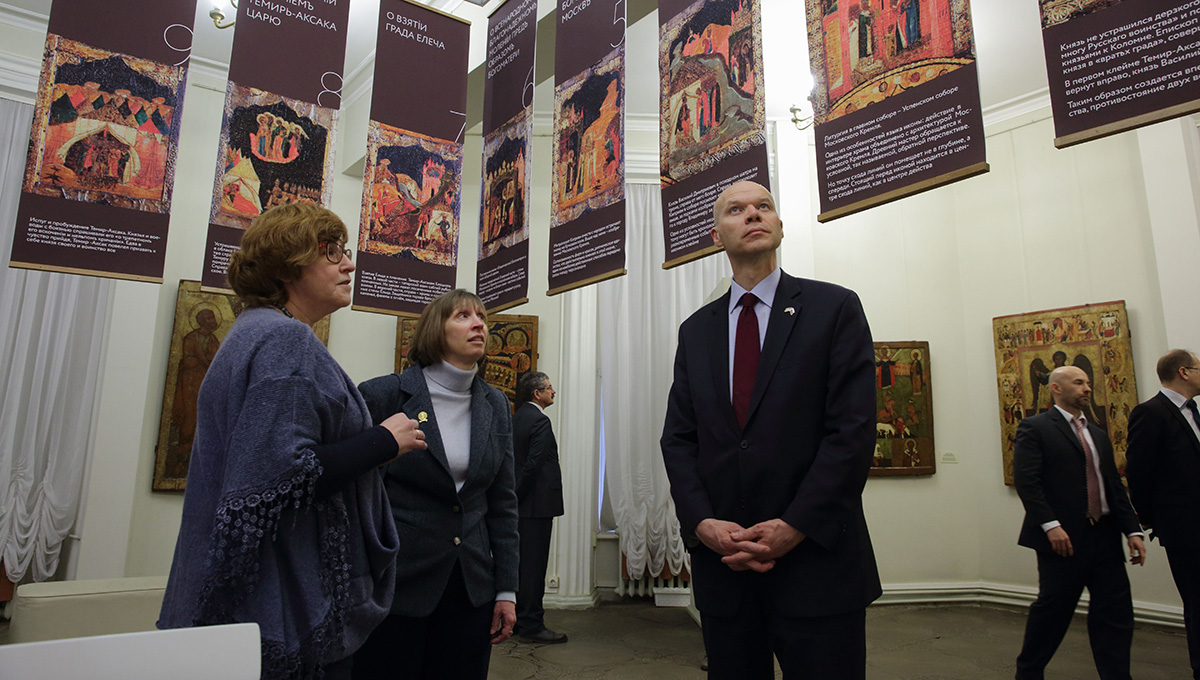 Директор Пермской художественной галереи Юлия Тавризян (слева) показывает коллекцию древнерусского искусства Линн Трейси и Маркусу Микели