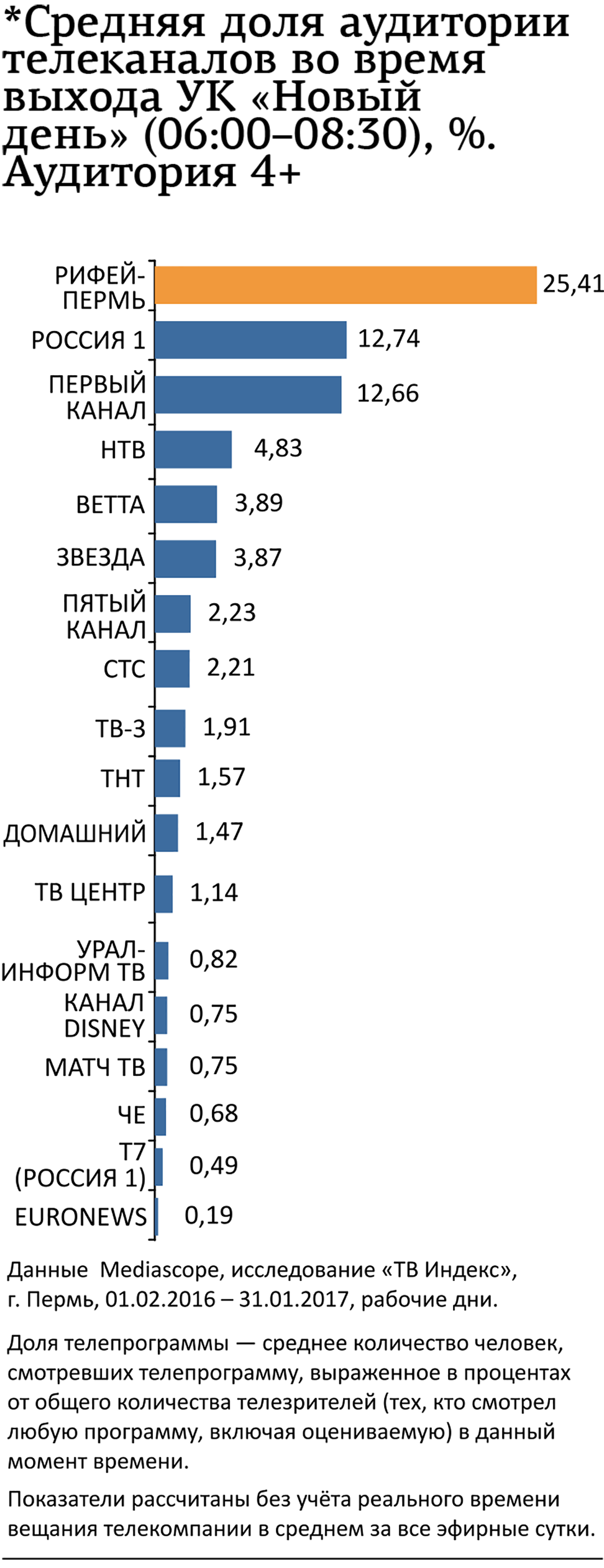 Неудивительно, что коллеги из телекомпании «РЕН ТВ» — сетевого партнёра телекомпании «Рифей-Пермь» — уважительно называют «Новый день» «тот самый утренний телеканал». «Тот самый» означает «тот, который обеспечивает мощное утро — базу для всего суточного эфира». Неудивительно, что «РЕН ТВ» даже не пытается предлагать «Рифею» собственный эфирный продукт на утреннее время — зачем, если и так всё отлично?