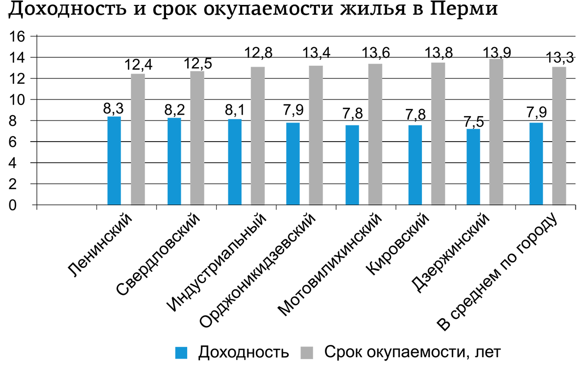 Пермь занимает шестое место среди 15 городов-миллионников РФ по показателю годовой доходности жилой недвижимости. Он составляет 7,9% при средней стоимости «квадрата» 50 536 руб. и средней величине арендной платы 337,9 руб. за 1 кв. м. Окупаемость «средней» сдаваемой в аренду квартиры в Перми составляет 13,3 года.