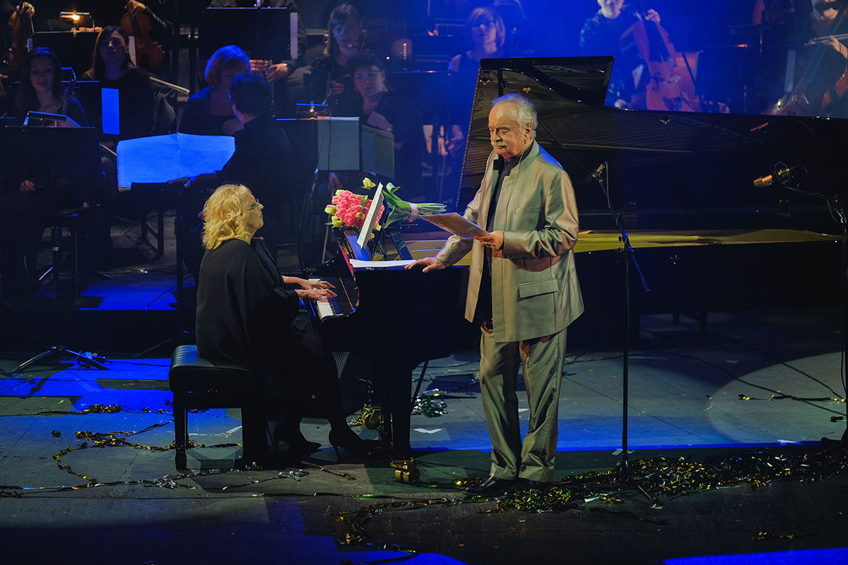 Затем рояль снова уступили профессионалам. Композитор Лора Квинт и поэт Николай Денисов, авторы мюзикла «Монте-Кристо. Я — Эдмон Дантес», а также музыкально-поэтических фрагментов спектакля «На всякого мудреца довольно простоты» в оригинальной постановке Бориса Мильграма, который нынче номинируется на «Золотую маску», поздравили театр специально сочинёнными виршами, артистично исполненными поэтом под аккомпанемент композитора: