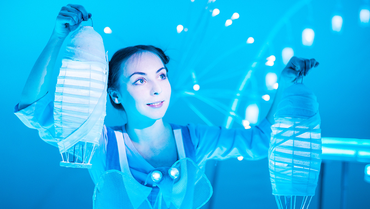 Словно в сказку входит в летний мир природы героиня спектакля, девочка, которую играют по очереди Кристина Цуркан и Анастасия Кузнецова. Как и в прочих спектаклях Янушкевича, актриса здесь не прячется за ширму и не делает вид, что «куклы могут сами говорить». Нет, режиссёр понимает, что суть кукольного театра — игра, детская игра в куклы, вот и героиня одновременно общается с насекомыми и играет в них. Никаких проволочек, перчаток и прочих ухищрений: надо передвинуть улиточку — берёт и переставляет; надо изменить выражение «лица» мотылька — руками поворачивает глазки, расправляет усики. Удивительно, но волшебный эффект от этого не теряется — куклы оживают, как это и должно быть в настоящей самозабвенной игре.