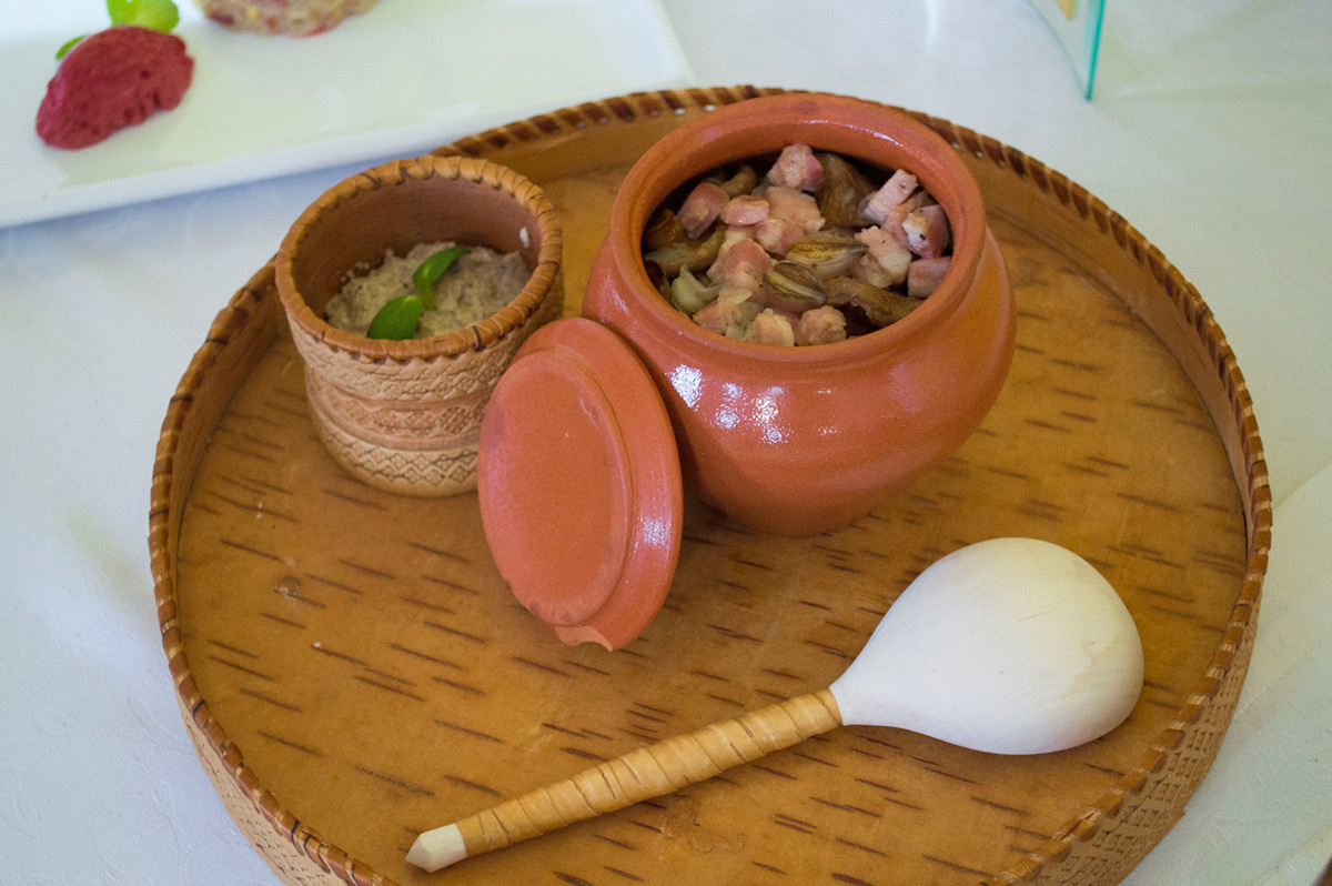 Наверное, самым захватывающим был конкурс каш. Вы себе не представляете, какое это гламурное блюдо — каша! Я теперь представляю. То есть всегда хотелось относиться к ней как к десерту, но идея затолкать кашу в сладкую вафельную трубочку, согласитесь, не самая банальная. Каши подавали с паштетами из рыжиков и прочими грибными соусами, к ним прилагался бульон (развели да и превратили кашу в суп), варенье из шишек, кисели, мёд и вообще всё! Одному из юных конкурсантов попеняли на то, что не хватило воображения на что-то большее, чем клубника: «Вы же с севера, у вас же там жимолость, черёмуха, рябина!» Согласимся.