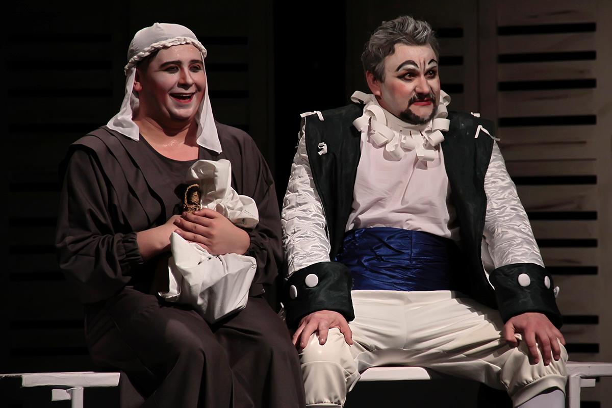 В полном соответствии с клоунско-цирковой эстетикой художник Ольга Вологина сочинила костюмы персонажей — белые, как балахон Пьеро, забавные, снабжённые уморительными деталями: например, служанка Дорина увешана домашними инструментами — от щёток и мусорного совка до молотков. И ведь пригождаются инструменты-то!