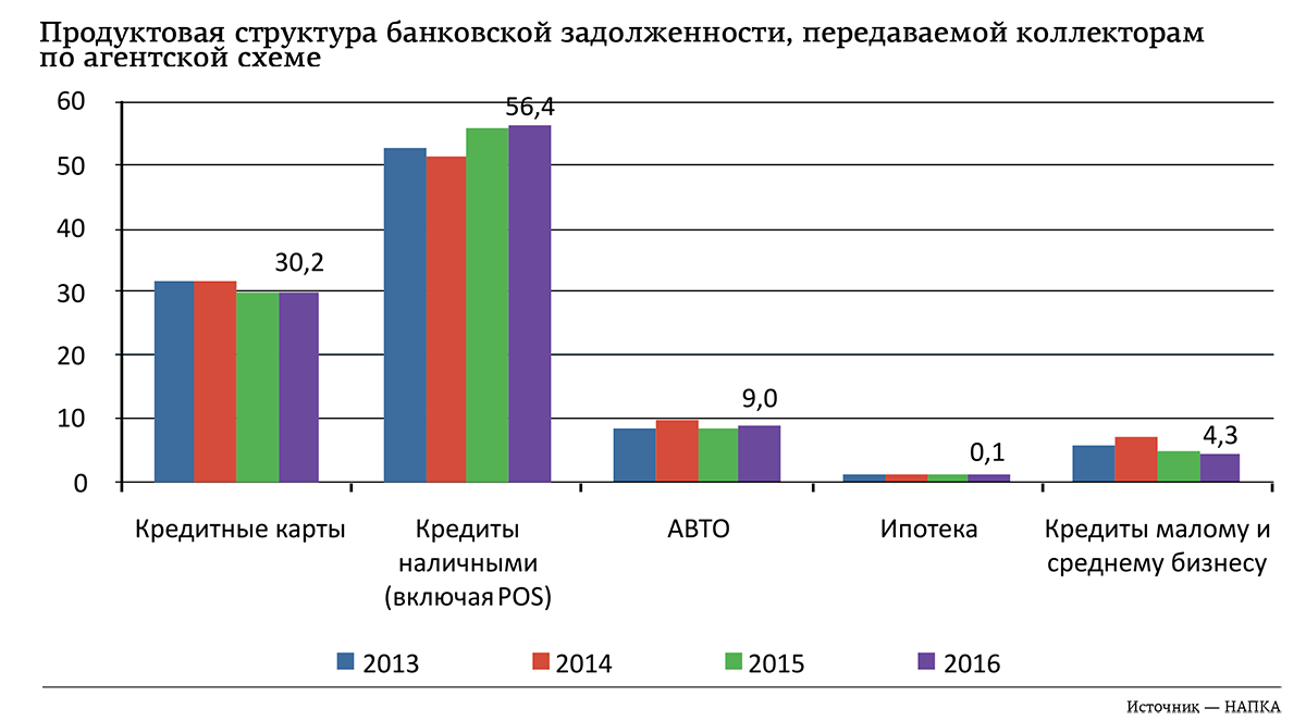 Интересно, что продуктовая структура задолженности, передаваемой коллекторам, не совпадает со структурой всей просроченной задолженности. Например, если на долю ипотеки в Пермском крае приходится более 8% просроченной задолженности физлиц, то доля этого вида кредитования на рынке профессионального взыскания — лишь 0,1%. В то же время, отмечают в НАПКА, на кредиты наличными приходится 56% всей передаваемой коллекторам задолженности, на кредитные карты — ещё 30%.