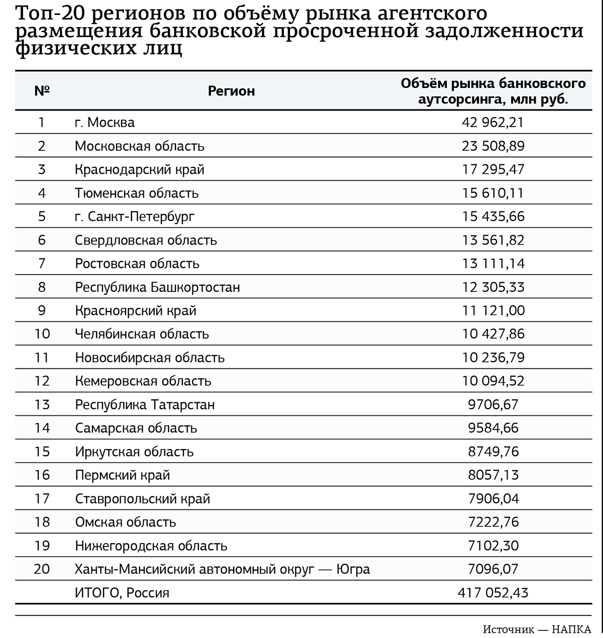 Из этих цифр следует, что банки региона самостоятельно взыскивают 60% просроченной задолженности по кредитам физлиц (включая ипотеку), а оставшиеся 40% передают коллекторам на условиях агентского взыскания. Интересно, что в среднем по России, по данным НАПКА, на долю коллекторов приходится существенно больше — порядка 50—60% просроченной задолженности по банковским кредитам физлиц.