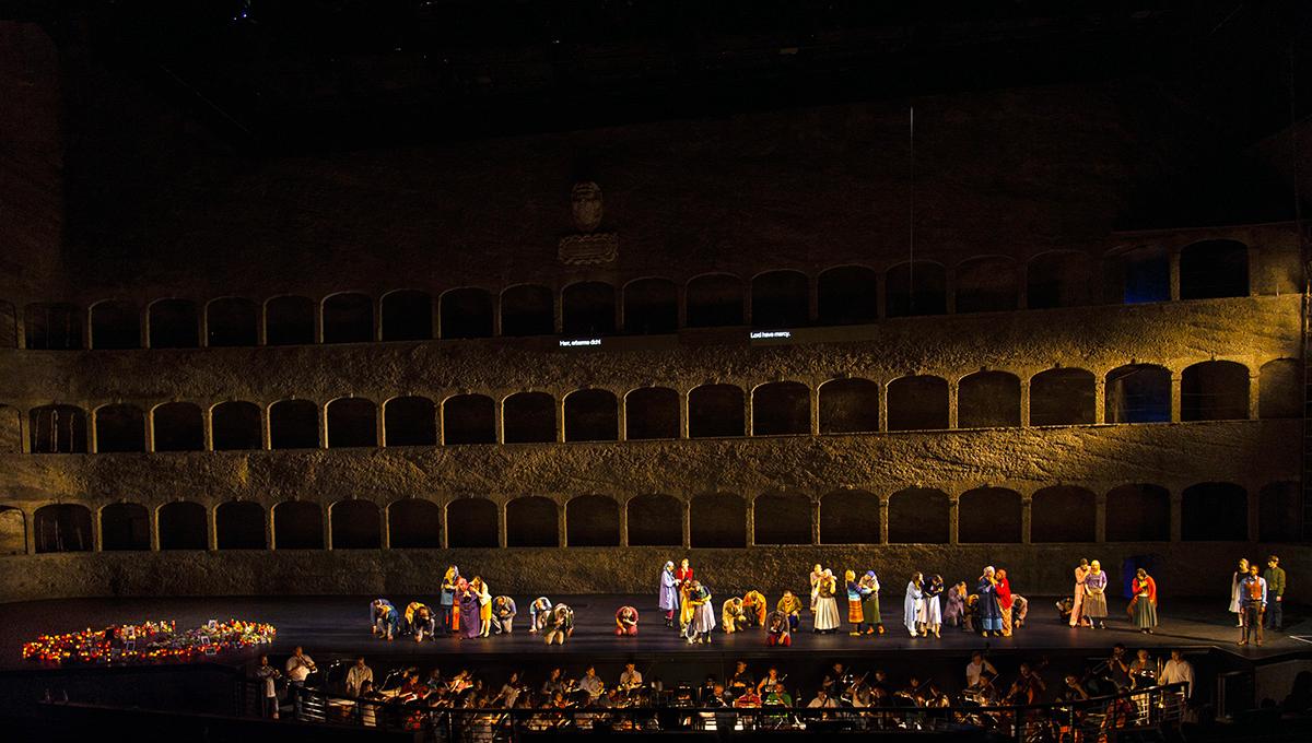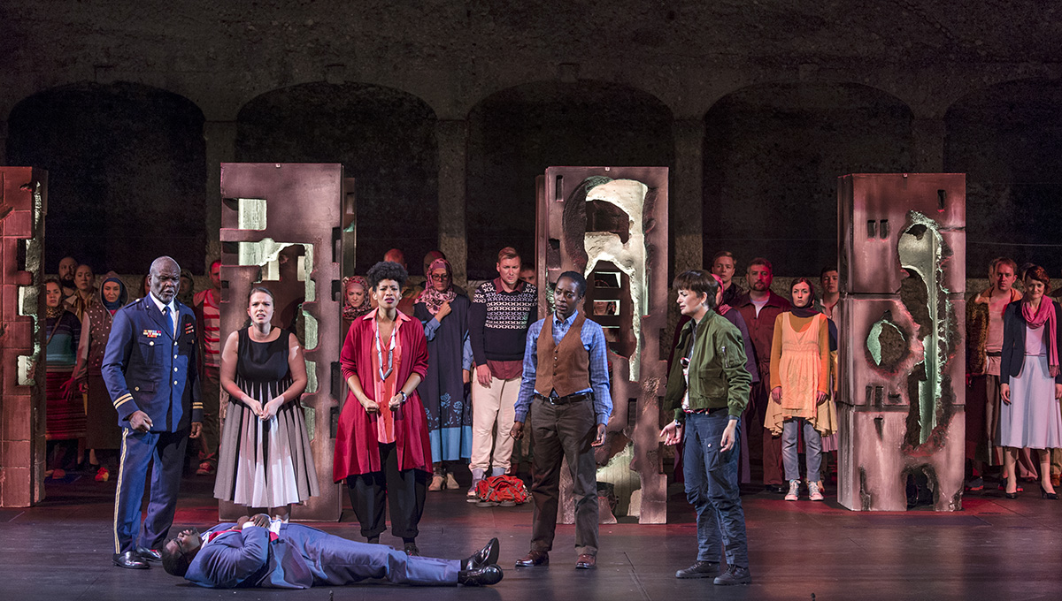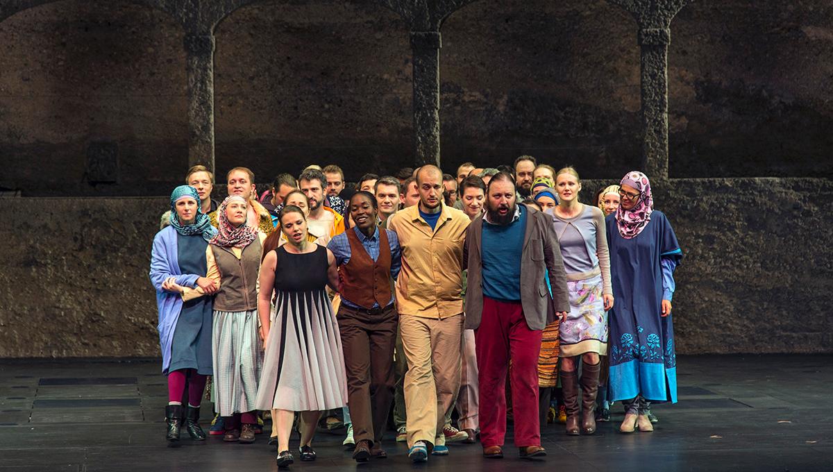 Этот важный режиссёрский мессидж несёт на себе хор, то есть — простые люди, в основном беженцы в пёстрых этнических нарядах. Хор вообще в этой постановке, как и в других проектах Курентзиса, очень активен: есть даже момент, когда он выходит в зал и буквально обращается к зрителям. Он настолько ярок и энергичен, что солисты, поющие чрезвычайно аккуратно и ансамблево, оказываются в тени.