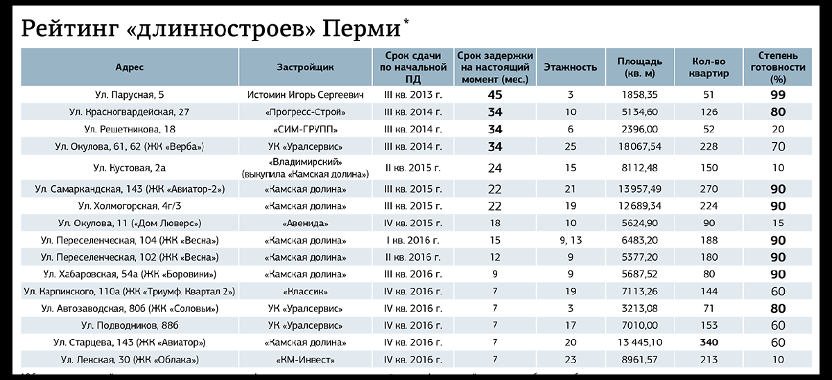 Всего в этот список попали 16 объектов с задержкой сроков сдачи от семи до 45 месяцев. Из них семь домов строятся «Камской долиной», три дома — УК «Уралсервис».