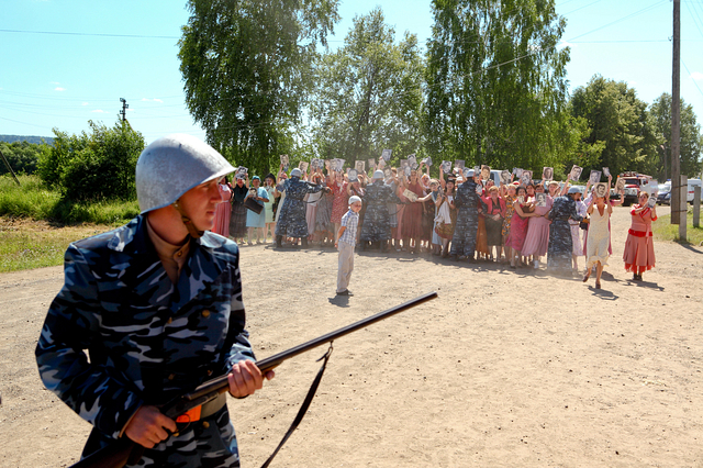 Один из самых спорных моментов в спектакле — путь из зоны строгого режима в зону особого режима. Вдоль всей дороги стоят женщины с портретами заключенных — реальных политических заключенных, сидевших когда-то в этом лагере, — и кричат: «Найдите моего мужа! Передайте, что мы ждем его!» «Охранники» в бутафорском камуфляже начинают их отгонять прикладами, а те их лупят портретами по голове. То там, то тут вспыхивают совершенно нелепые потасовки, и если поначалу впечатляешься тем, как женщины — волонтеры, а не профессионалы, между прочим, — вошли в роль, то к концу пути становится просто весело.