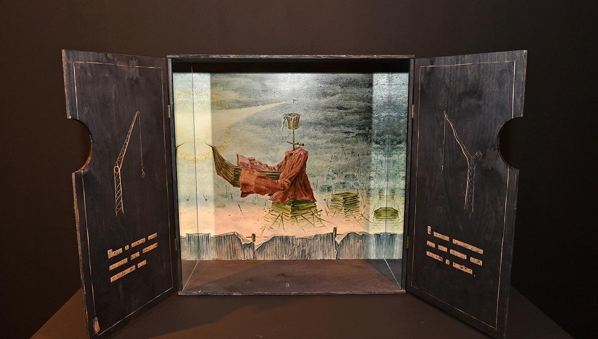 Здесь же появляются работы Андрея Оленёва — очень рукодельные, фантазийные и мастерски выписанные, они доставят удовольствие всем — и тем, кто любит искусство сложное, концептуальное, с замыслом, и тем, кто любит просто красивую живопись. Работы Оленёва там и тут появляются на протяжении всей выставки, каждый раз заставляя остановиться, вглядеться и порадоваться. Вот, к примеру, складень-трельяж, расписанный средневековыми босховско-брейгелевскими мотивами: там и корабль дураков, и Доктор Чума…
