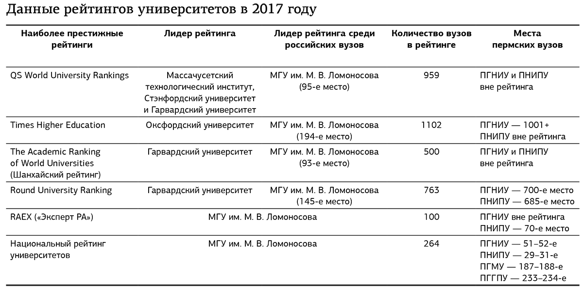 При этом существует множество частных рейтингов, о которых вузы могут совсем не знать, даже если оказываются в числе их лидеров. Примером здесь может стать рейтинг российских вузов по версии благотворительного фонда Владимира Потанина, в котором ПГНИУ, например, занял 16-е место из 75 возможных.