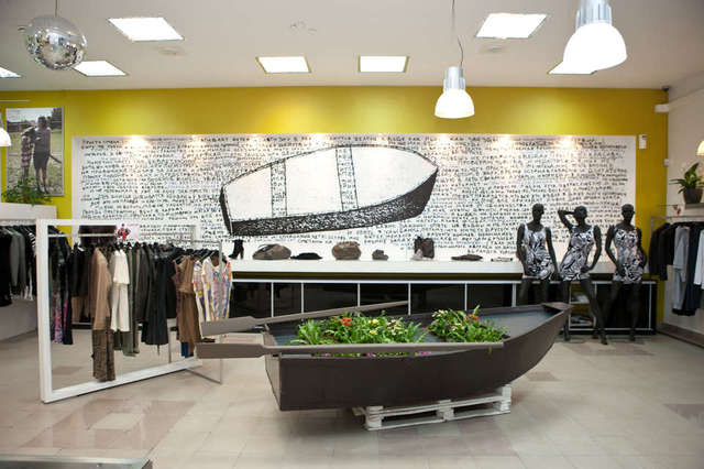 Можно даже просто разглядывать стены, покрытые остроумными граффити — рисунками и надписями, сделанными харьковскими художниками Романом Мининым и Гамлетом. Магазин, как театр, начинается с вешалки: на стене нарисована вешалка и написано: «Это только начало».