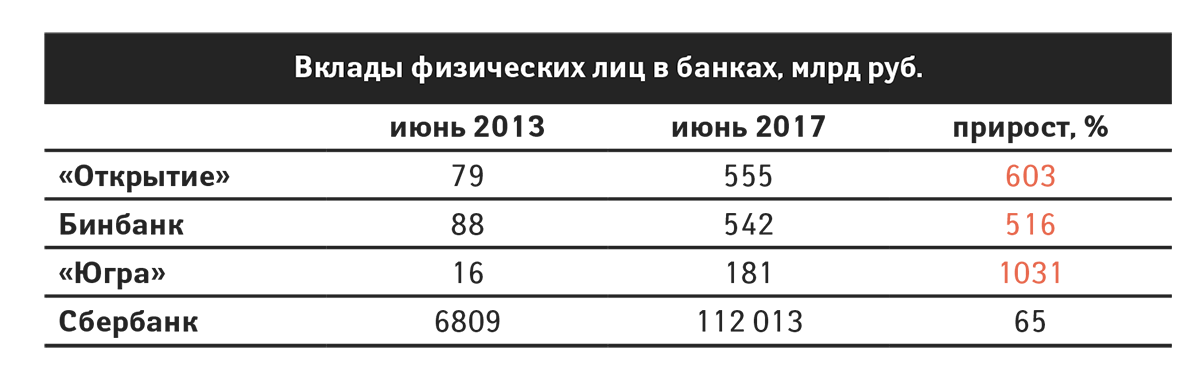 В-третьих, активное участие в санации. «Открытие» в 2014 году санировало банк «Траст» со 138 млрд руб. средств физических лиц, а Бинбанк в том же году — банковскую группу Рост Банка.
