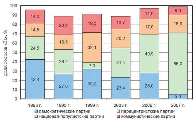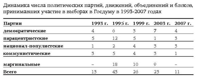 Начиная с 1993 года в ходе выборов в Госдуму поддержки избирателей добивались более 100 политических игроков. К 2007-му их число сократилось до 11.