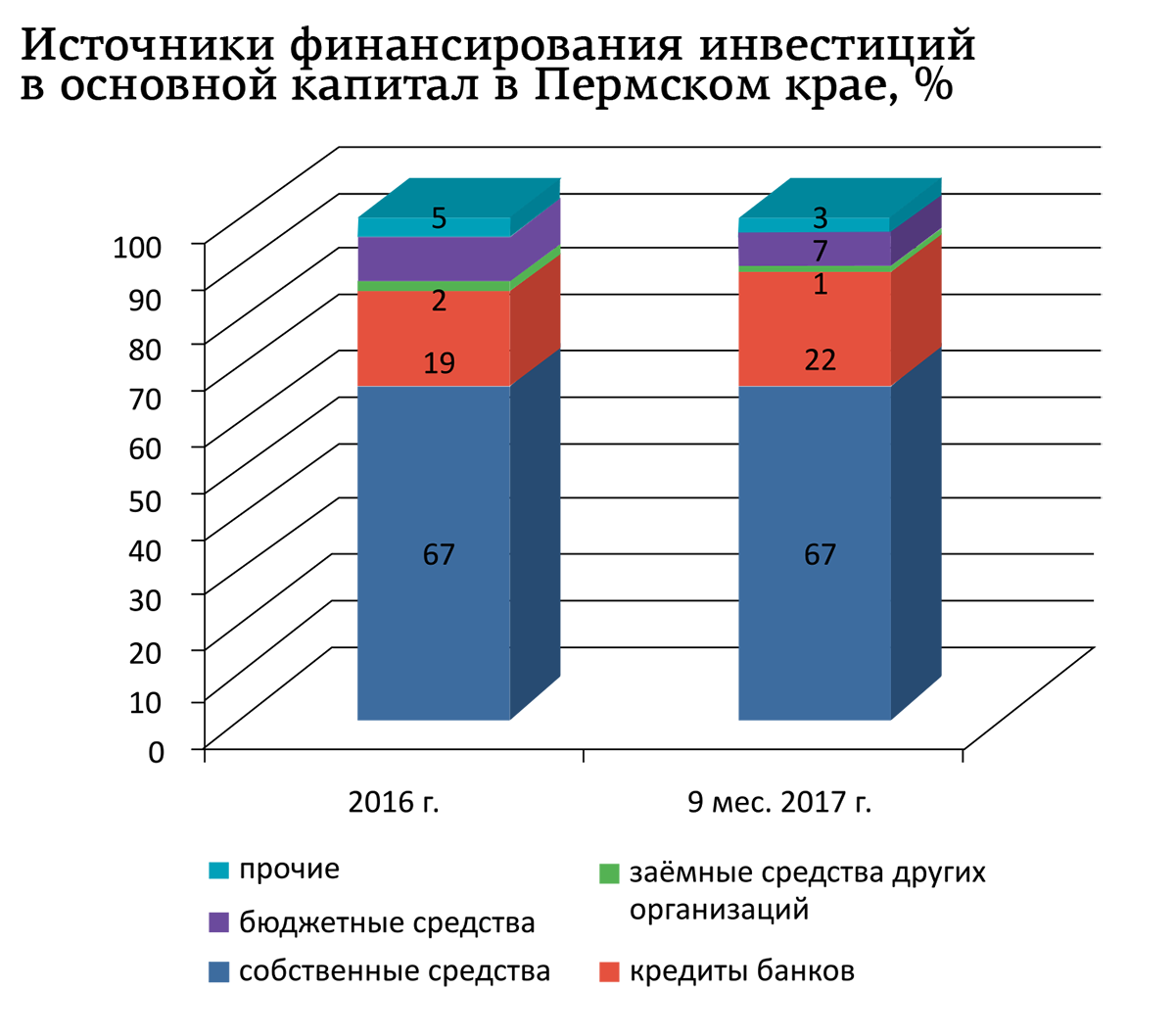 Основным источником инвестиций в собственный капитал по-прежнему остаются собственные средства предприятий и организаций: на их долю, как и в прошлом году, приходится 67% вложений. Однако произошло перераспределение в рамках заёмных источников. Со стабилизацией экономики в целом и финансового сектора в частности банковские кредиты всё чаще становятся источниками инвестиций: сейчас на их долю приходится 22% вложений. Одновременно снижается значение других заёмных источников — средств бюджета и заёмных средств других организаций.