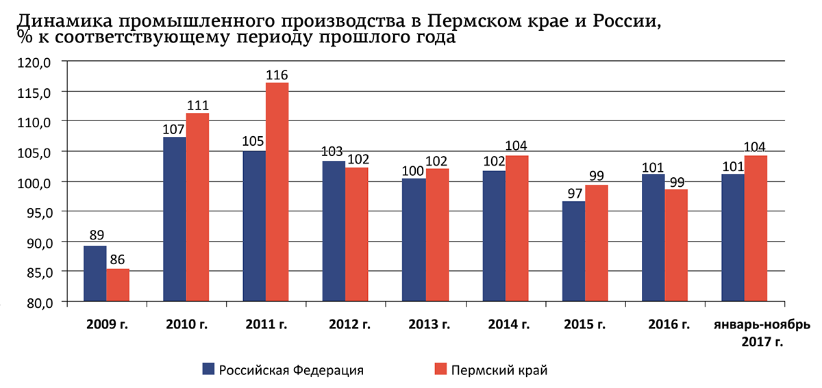 Индекс промышленного производства в Пермском крае по итогам января—ноября 2017 года составил 104,2%, и это даже больше, чем средняя по России цифра (101,2%). Стоит отметить, что этот показатель поднимался выше отметки 100% уже с конца прошлого года, однако тогда это нельзя было считать устойчивой тенденцией, поскольку она касалась не всех отраслей. Теперь ситуация иная: подавляющее большинство отраслей промышленного сектора по итогам 11 месяцев стабилизировались и начали увеличивать объёмы выпуска продукции.