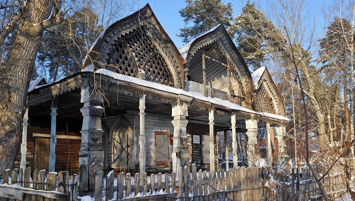 Километром выше по Каме стоит одноэтажный терем с фронтоном из трёх килевидных закомар, со стены которого сразу две таблички сообщают: перед нами памятник архитектуры. Что, впрочем, понятно и без них. Изысканная пропильная резьба трельяжа и подзора, накладная резьба на сандриках и наличниках в сочетании с диковинными формами здания говорят, что это выдающийся пример деревянного зодчества эпохи модерна. Дача была построена в конце XIX века, что косвенно подтверждают казначейские бумаги 1890-х годов, которыми был оклеен первый слой штукатурки.