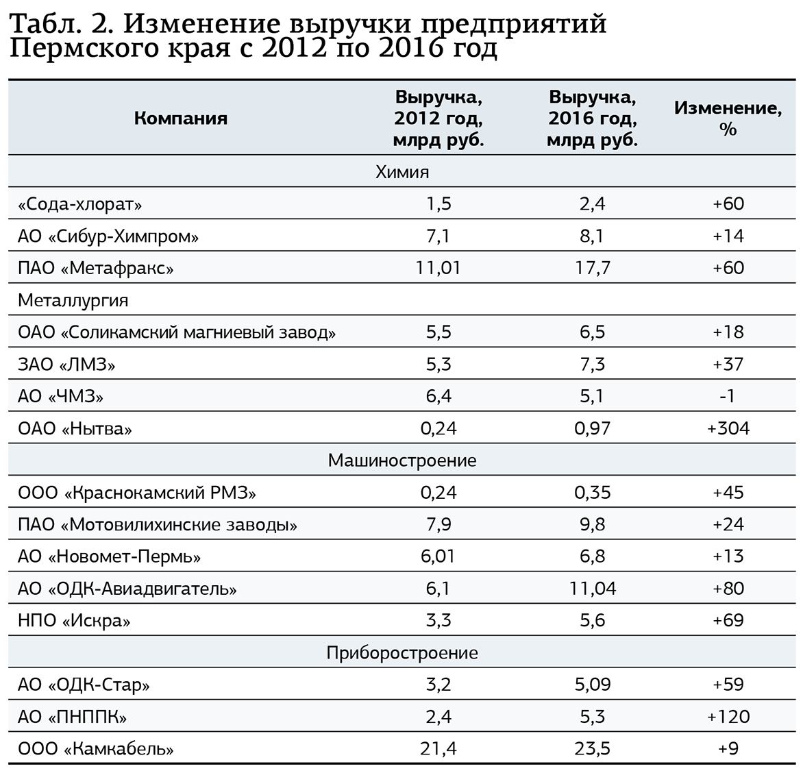 Несмотря на очевидное влияние кризисов, многочисленные негативные тенденции, за пять лет (с 2012 по 2016 год) ведущие предприятия смогли нарастить объёмы продаж продукции, некоторые из них — многократно (см. табл. 1).