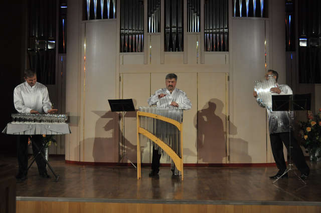 Второе отделение посвятили русской музыке, ведь наши классики всегда тяготели к волшебству сказок. «Музыкальную табакерку» Лядова сменил «Балет невылупившихся птенцов» Мусоргского, потом звучал Чайковский. С вокалом — «Сирень» Рахманинова. Раньше стеклянная гармоника звучала во дворцах и салонах, для неё писали Глюк, Моцарт, Бетховен, ее ввёл в партитуру «Руслана» Глинка. Музыканты «Хрустального трио» исполняли в Перми переложения. Узнаваемые мелодии вызывали восторг переполненного зала. Представив на бис Венгерский танец Брамса и «Ave Maria» Баха-Гуно, мужчины галантно преподнесли Олесе Мезенцевой в честь дебюта свои розы. Не забыли поздравить всех с наступающим Новым годом, поиграли и на бутылках, в том числе из-под «Hennessi», рассказали байку про «Стаканьолу» (так одна слушательница назвала их программу). Обещали приехать ещё. А потом был главный сюрприз: всех желающих пригласили на сцену. И стекло чуть-чуть отозвалось…