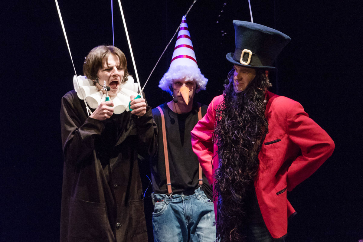 Знаменитая цитата прозвучала уже в первой миниатюре вечера. Театр кукол, открывший программу гала-концерта, доверил её своему главному герою — Буратино. Действие мини-спектакля происходило в театре Карабаса-Барабаса, где куклы возмущены, что их не держат за людей. Бунтующие марионетки намерены бросить Карабаса и поступить в Театр-Театр, где Буратино хочет сыграть карлика Носа, Пьеро — работать фонтаном-фонтаном (артист, играющий куклу, зарыдал в три ручья), а Артемон — податься в режиссуру и поставить «Собачье сердце».