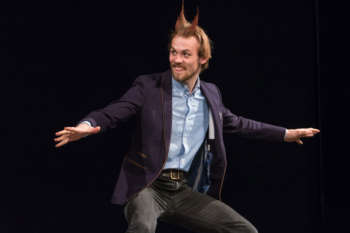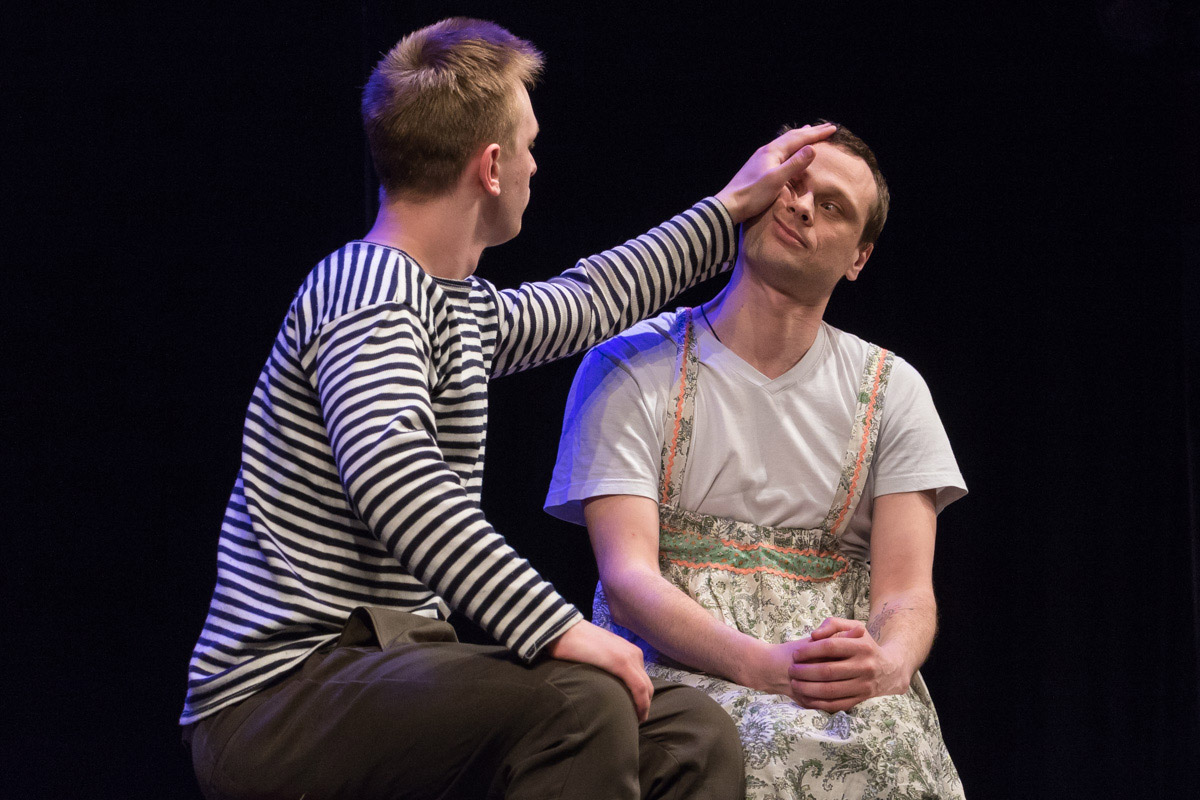 С нетерпением зрители ждали выступления камерного театра «Новая драма», и постоянные лауреаты конкурса их не обманули. Прекрасная миниатюра, сочинённая, как всегда, талантливыми и харизматичными Сергеем Толстиковым и Дмитрийем Огородниковым, это настоящая «новая драма» — прекрасный, очень складный текст, живая органика актёров плюс немного эксцентрики: первым на сцене появляется Константин Жижин, практически раздетый, как говорит он сам, «в трусишках», а затем Алексей Корсуков, играющий... старуху Изергиль. Наконец, выходит коронный дуэт всех капустников «Новой драмы» — Сергей Толстиков и Дмитрий Огородников, и начинается стендап-комедия, пересказать которую чрезвычайно трудно, и очень трудно вычленить отдельные остроты, так плотно они цепляются друг за друга в активном диалоге героев.