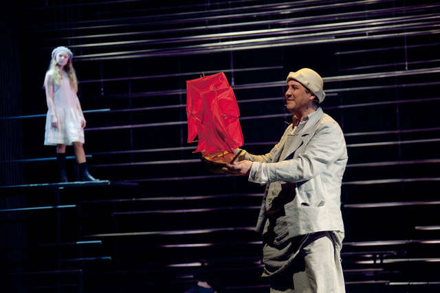 Когда смотришь новый спектакль пермского Театра (драмы) — Театра (мюзикла), то и дело поражаешься: до чего же великое это произведение — маленькая повесть Александра Грина «Алые паруса»! Вот уж действительно, книга на все времена. В отличие от большинства других гриновских феерий, «Алые паруса» — вещь бесспорно позитивная, и на каждом новом витке социальной истории в ней находятся новые смыслы. Она пришлась очень ко двору в советские времена, когда в ней легко читался пафос «чуда, сделанного своими руками». В наши дни, оказывается, можно, не отказываясь от заложенного в сюжете позитива, изложить историю не так однозначно и радостно.