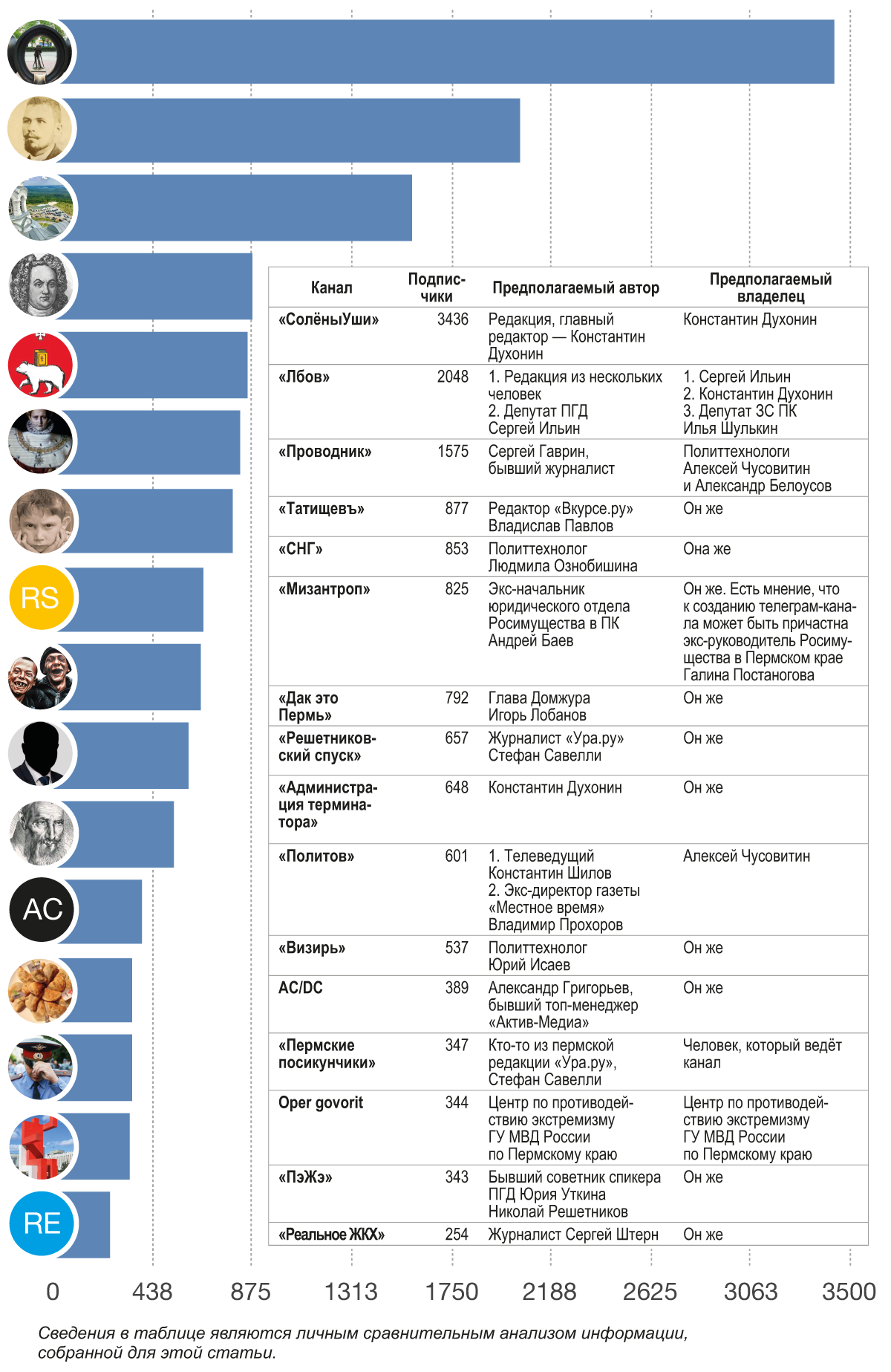 Самые цитируемые и популярные Telegram-каналы в Перми — это «СолёныУши», «Проводник», «Мизантроп», «Политов», «Лбов», «Татищевъ» (полный обзор с вероятными авторами и владельцами — в таблице).