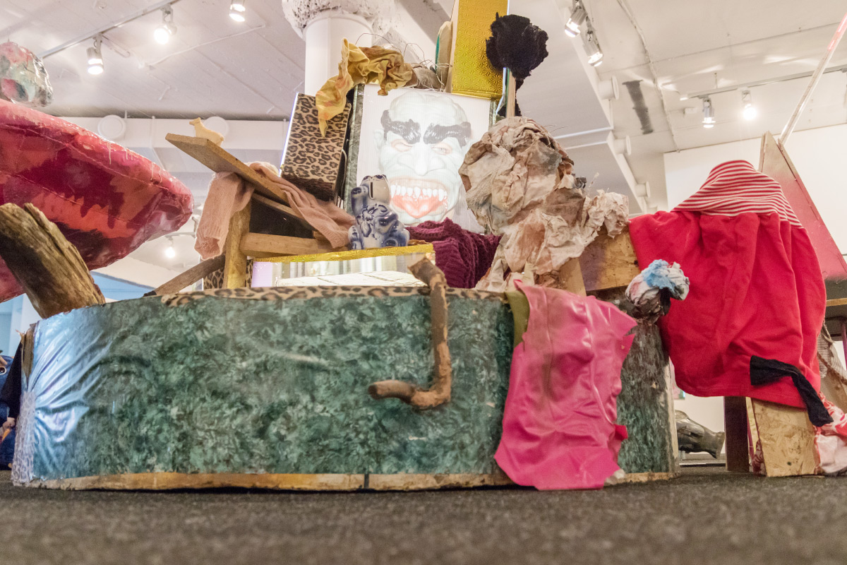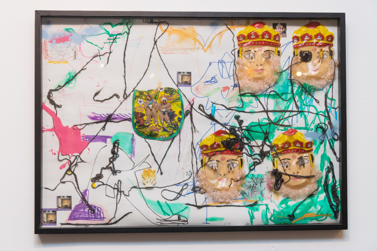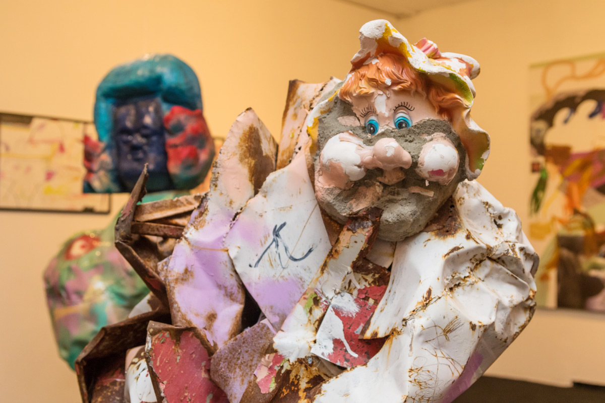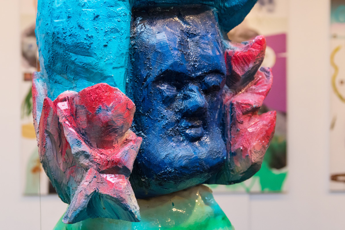 Город стоит не сам по себе, он вписан в большой окружающий мир. Выставка кажется абсолютно единой, но на самом деле она составлена из трёх авторских проектов – «Утопия драконов» (сам город), «Крем-брюле» – несколько добавочных скульптур и «Гиперпрыжок и муравьед» – большие коллажи, которые, собственно, и обеспечивают ощущение широкой, планетарной реальности, каких-то равнин, гор и морей, которые окружают Утопию драконов и продолжаются где-то за горизонтом. Сложная техника – живопись, рисунки карандашом и фломастерами, печать на бумаге и виниле, коллажи и ассамбляжи – вылезла за рамки отдельных произведений и разместилась прямо на стене зала музея, где вся эта красота неизбежно погибнет, как только выставка закроется.