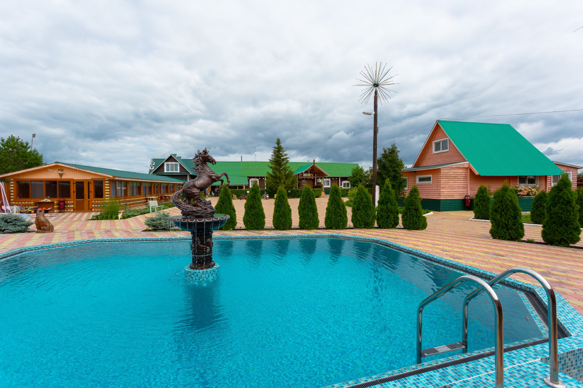 На территории комплекса красиво расположились несколько гостевых домов, банный комплекс, три банкетных зала, уличные бассейны с подогревом — и, кстати, сезон шезлонгов уже открыт. С мая по октябрь работает шатёр летнего кафе, а прохладными вечерами вы можете уютно провести время в кафе-баре с камином. Вы можете заказать чайную церемонию. В каждом гостевом доме и в каждом банкетном зале есть караоке, бильярд и настольные игры; лазертаг и пейнтбол, катание на сегвеях и гироциклах, экскурсии в страус-парк и полёты на мини-вертолётах, стрельба из лука, арбалета, пневматического оружия — далеко не полный перечень развлечений.