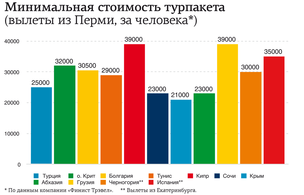 Есть среди предложений сезона Кипр, но продажи этого направления небольшие. На этом рынке в Перми работает только один оператор «Библио Глобус», конкуренции нет, поэтому цены на путёвки достаточно высокие (100 тыс. руб. на двоих на 10 дней было до последнего скачка курса евро).