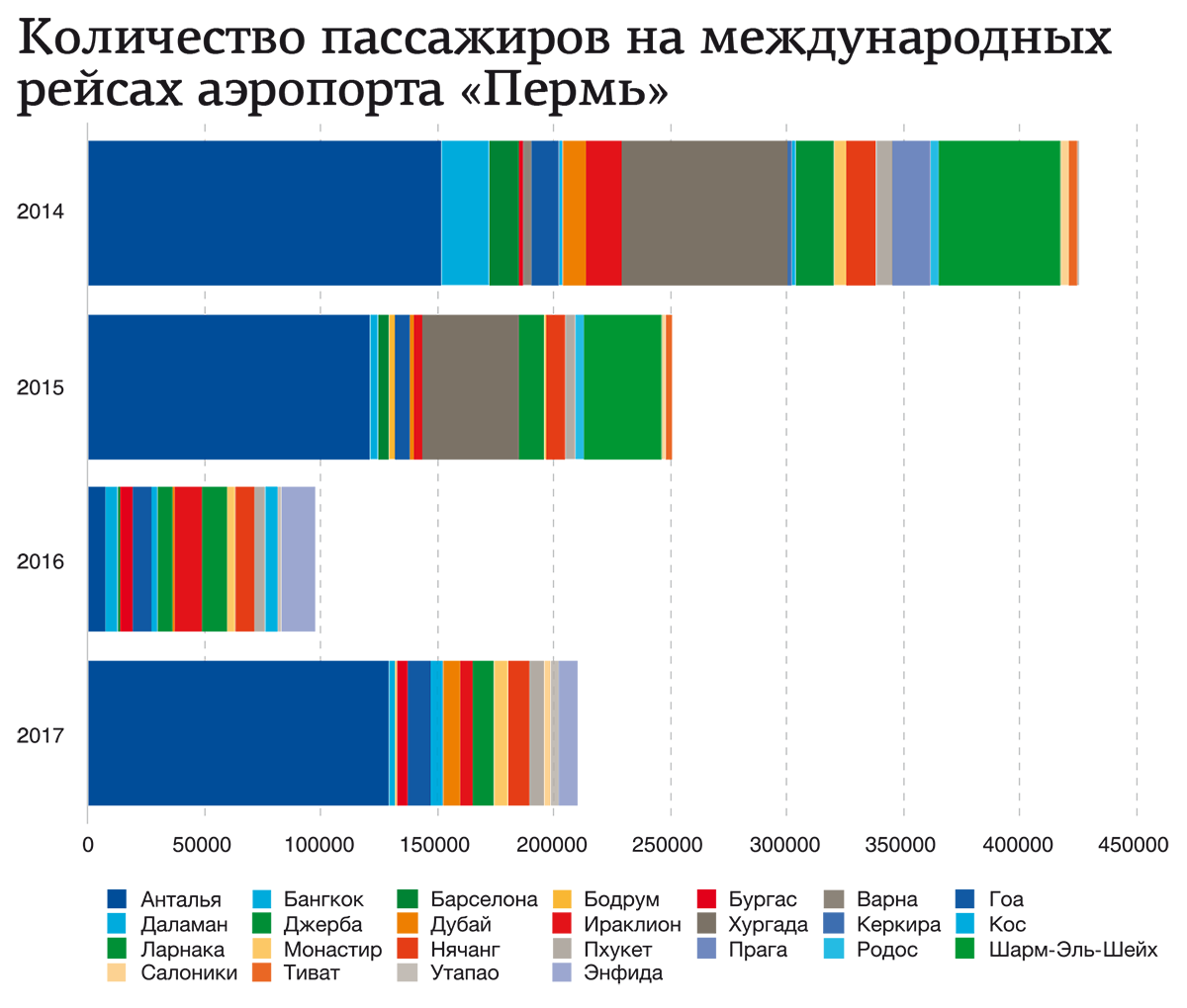 Чартерные цепочки из Перми в Таиланд и Вьетнам закончились 9 апреля. Вылеты откроются только в октябре. Участники рынка сообщили, что на предстоящее лето чартерные программы из Перми планируются в Турцию, Болгарию, на Кипр, в Тунис, Грецию (остров Крит), Сочи и Крым. По всем остальным направлениям — только регулярные перевозки. В этом году из Перми нет чартера в Испанию, поскольку в предыдущие два года продажи были очень плохими. Грецию (Халкидики) в прошлом году турфирмы «закрывали» с большими проблемами, поэтому на континентальную часть этого полуострова нынче чартеров нет. Убрали из чартерной программы Родос, также за неимением спроса.