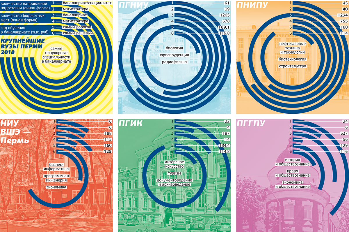 В 2018 году больше всего специальностей среди пермских вузов представлено в Пермском государственном национальном исследовательском университете: 61 направление в бакалавриате, 39 — в магистратуре. Меньше всего в НИУ ВШЭ — Пермь. Наибольшее количество бюджетных мест в Пермском крае абитуриент может найти в Пермском национальном исследовательском политехническом университете (1234 в бакалавриате), наименьшее, если брать исследованные вузы, — в Пермском государственном институте культуры (197).
