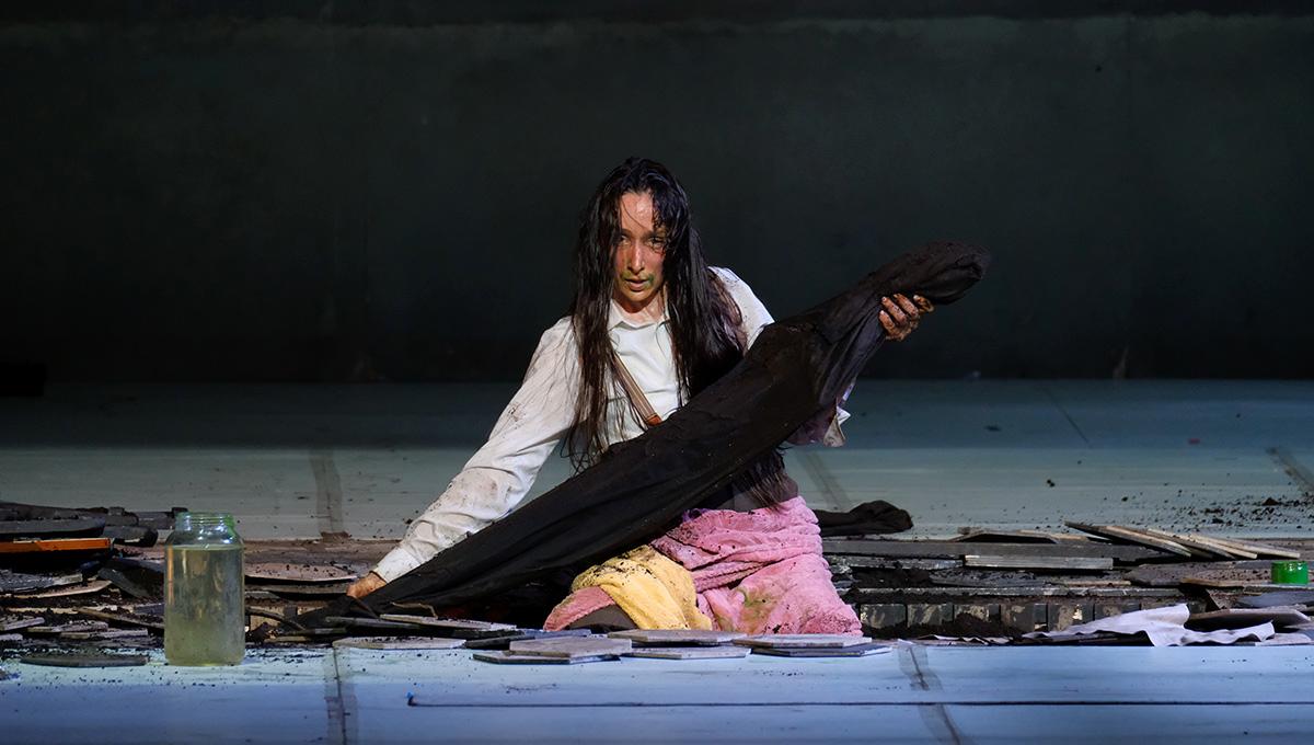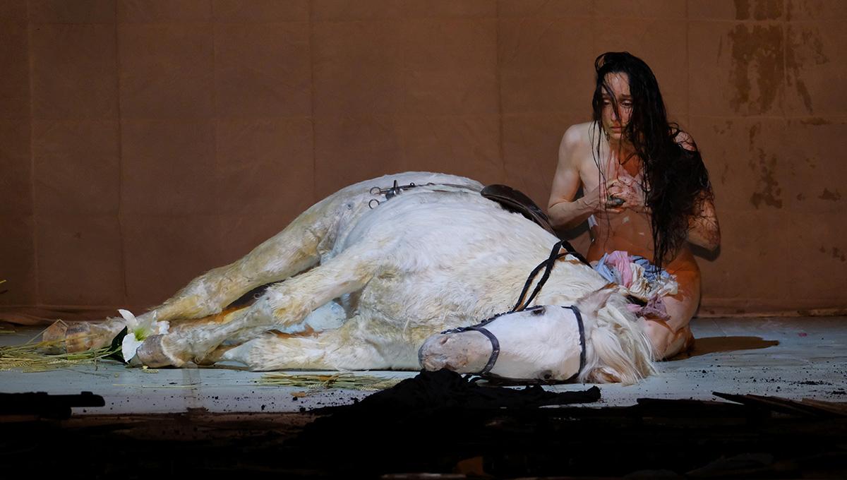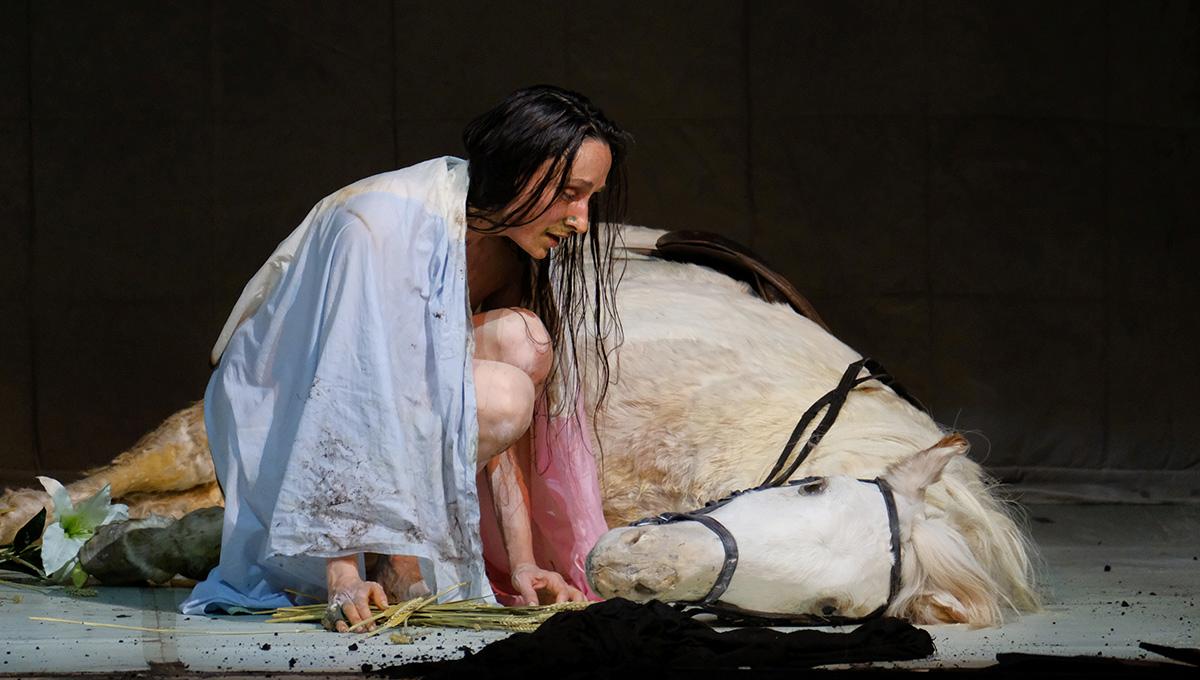 В тюремной камере перед страшной казнью Жанна абсолютно одинока среди звучащих голосов. Она бродит вдоль стен, вытаскивает на сцену мёртвого бутафорского коня, на котором скачет, лёжа на боку, вспоминая себя в пылу битвы, выдёргивает кран из батареи на стене и, подставляя лицо под струи воды, ощущает их каплями майского дождя. Кастеллуччи показывает зрителю одиночество — бесконечное, как космос. Хочешь помочь — и не можешь, ведь это только спектакль, а ты всего лишь зритель. Наверное, то же чувствовал Арсений Тарковский, написавший: