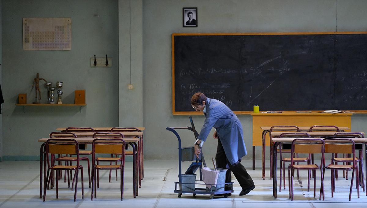 За поднятым занавесом тишина, школьный класс с неуютными люминесцентными лампами и часть коридора. Из звуков только лай собаки, шаги учительницы, изредка гул автомобильного мотора… Вдруг звонок, и девочки, только что сидевшие за партами, переговариваясь, покидают их. Появляется усатый худощавый уборщик. Прихрамывая, он наводит порядок, подметает, составляет вместе столы и стулья, а потом, словно боясь опоздать на сеанс воспоминаний, торопливо выкидывает мебель из класса. Освобождает стены от всего, что может напоминать о школе, превращая класс в тюремную камеру, а себя — в Жанну. Школа — здесь дети узнают историю о национальной героине Франции: она в сияющих доспехах с мечом в руках объединила страну, она наравне с мужчинами сражалась на поле боя, наверняка она была похожа на мужчину (неудивительно, что у неё усы). В какой-то момент Жанна, обмотанная полотенцами, с венцом на голове, сделанным из школьного растения, и с поднятой левой рукой превращается в карикатуру на саму себя, растиражированную статую святой, не знающей сомнений.